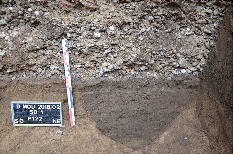 Enfin, à l’extrémité ouest du projet, les fouilles ont permis d’identifier une voie antique. Celle-ci reste ici mal conservée : la bande de roulement a intégralement disparue, mais sont conservés deux fossés bordiers et les couches de préparation. Son existence avait déjà été suggérée grâce à l’analyse des données lidar (relevés topographiques par laser). Cette voie antique semble recouvrir des traces plus anciennes d’occupation protohistorique, elles aussi attestées par la présence de trous de poteaux.