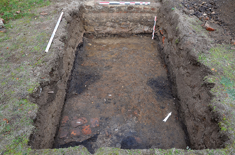 Le jardin situé au nord accueille deux constructions dont il ne reste rien, à savoir une possible annexe rurale en partie nord du sondage 1, et un vaste hangar sur poteaux à l’emplacement actuel du parc de stationnement.