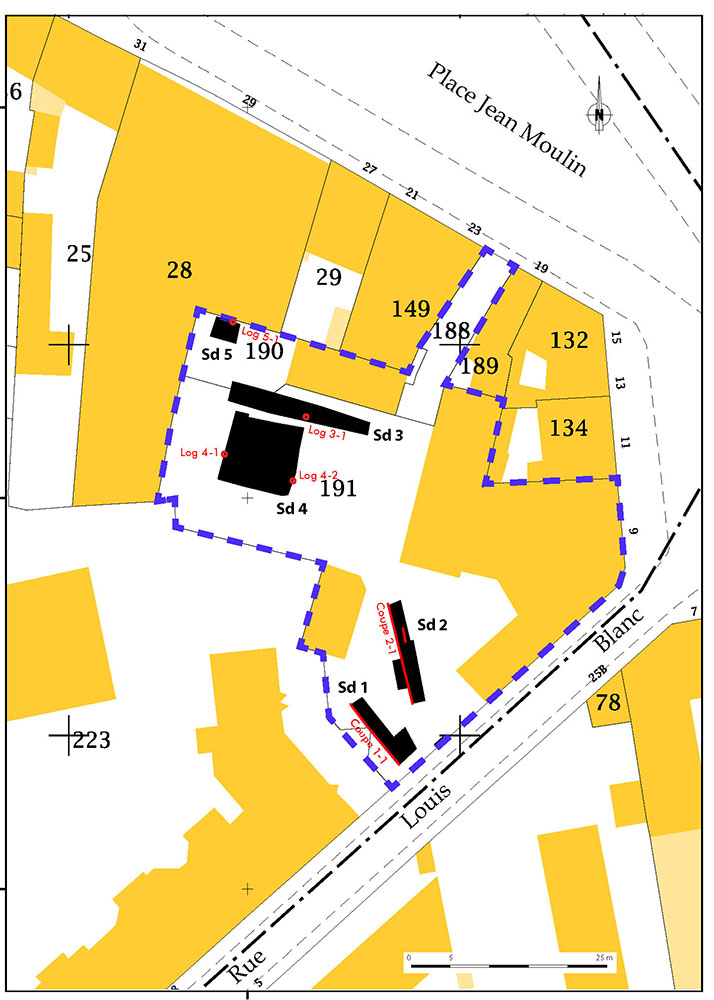 Entre le 22 mars et le 14 avril 2021, une équipe de trois archéologues du Service d’Archéologie Préventive du Département de l’Allier (SAPDA) a mené une campagne de fouilles sur la parcelle située au 3 rue Achille Roche, à Moulins, un site occupé autrefois par des bâtiments scolaires. Huit sondages archéologiques ont été ouverts, et la plupart se sont révélés positifs. Les découvertes permettent de mieux comprendre l’histoire de la ville basse de Moulins à la fin du Moyen Âge (14e-15e siècles) et à l’Epoque Moderne (1492-1789), notamment des éléments jusque-là inconnus.