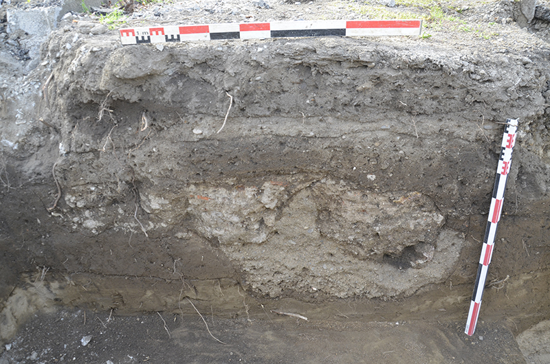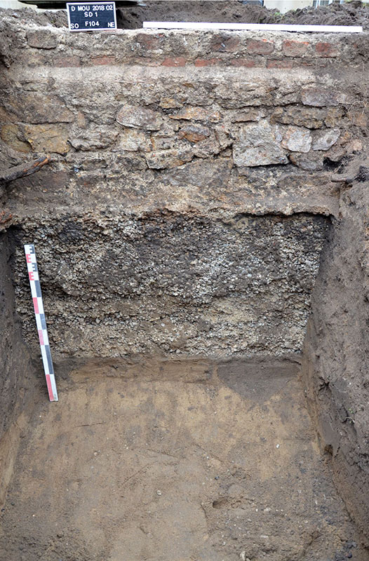 D’épaisses couches de terres agricoles anciennes ont été observées dans tous les sondages. Ces terres sont plus épaisses le long des rues actuelles (jusqu’à 2,30 mètres dans le sondage 3, situé sous l’aile nord) que dans la zone du parking ouest, où elles ne mesurent que 50 à 60 centimètres (sondages 7 et 8). Cela montre que les bords de la parcelle ont été cultivés très tôt et intensément, bien avant le cœur du terrain. Le mobilier archéologique (objets retrouvés) indique que ces terres ont probablement été mises en culture dès la seconde moitié du Moyen Âge (11e-15e siècles), une période encore peu documentée dans cette zone. Cette activité agricole semble avoir diminué au 18e siècle.