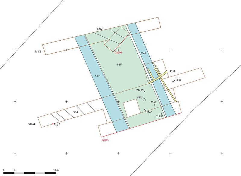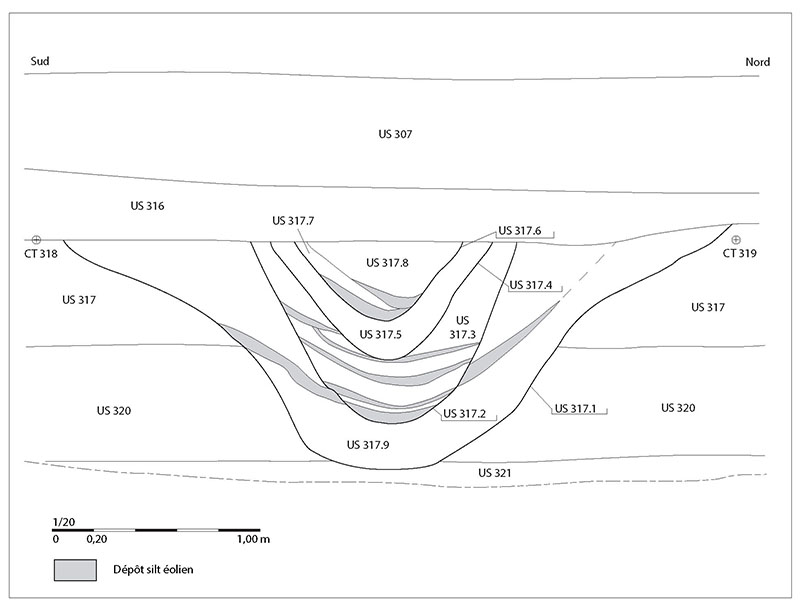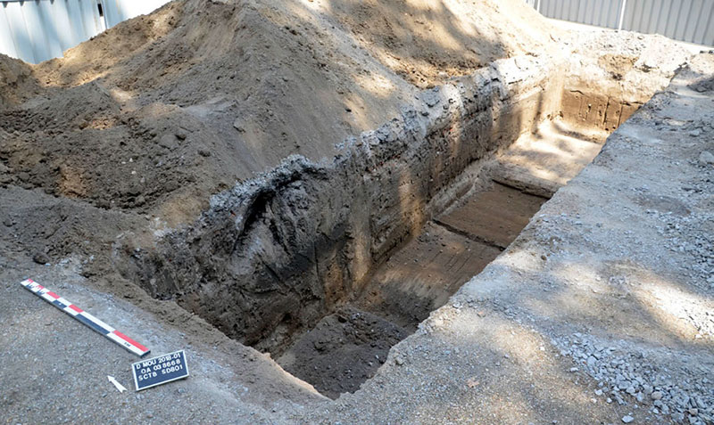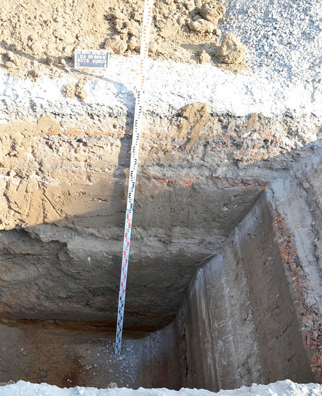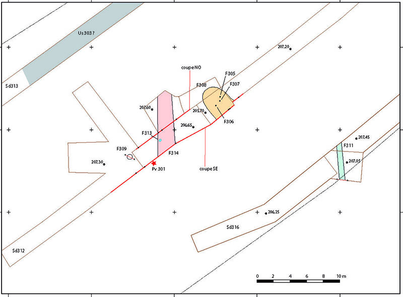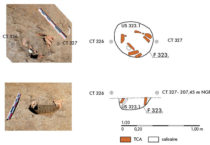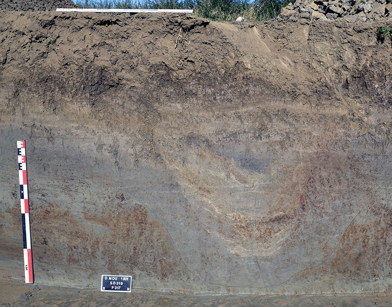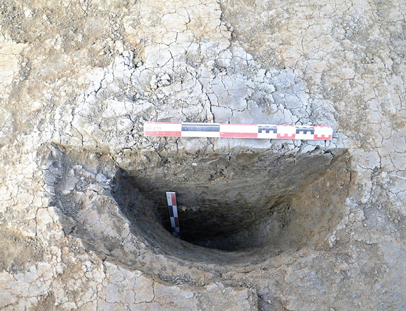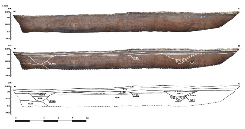 Un peu plus à l’ouest, environ à mi-parcours du futur tracé routier, une séquence stratifiée et un trou de poteau relativement bien conservé ont révélé une occupation protohistorique (2100 à 52 avant J.-C.) recouverte par des dépôts d’argile.