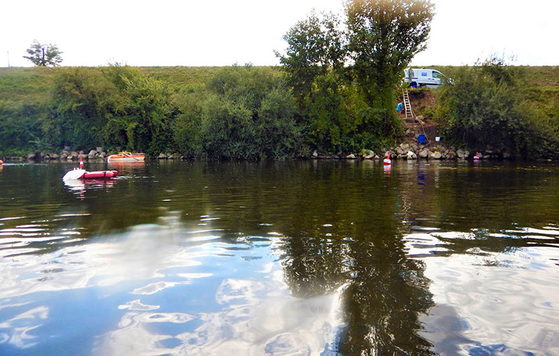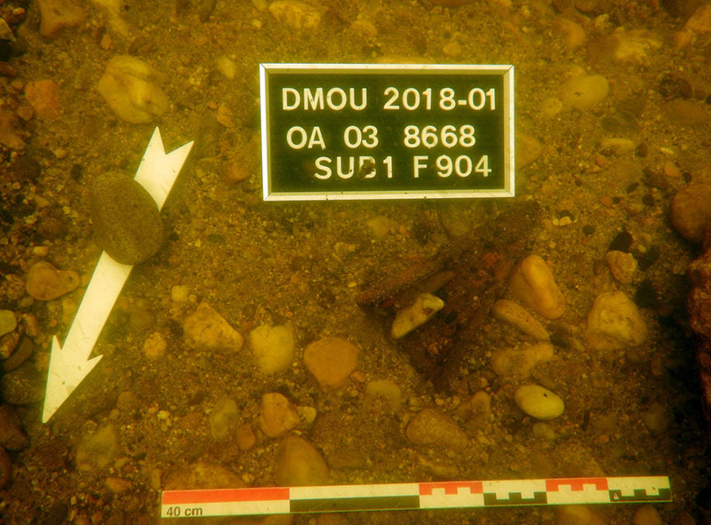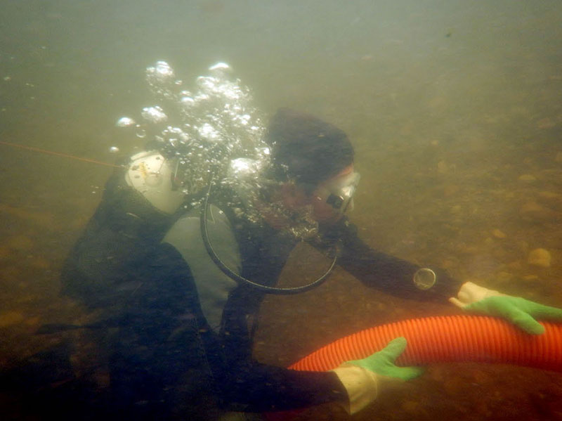 Du côté de la rive droite de la rivière, les sondages n’ont pas mis en évidence de structures humaines en place. Les couches rencontrées étaient composées de sables et de graviers d’apport moderne, parfois très épais. Quant au sondage manuel réalisé sous l’eau, ainsi que la prospection visuelle menée dans le lit de la rivière, ils n’ont révélé aucun vestige. L’archéologie subaquatique est une méthode un peu particulière, puisque nécessitant d’intervenir sous l’eau. Les archéologues sont alors équipés de combinaisons et de bouteilles leur permettant de respirer sous l’eau. Les méthodes de fouilles sont similaires, mais tous les gestes sont plus compliqués à mettre en œuvre.