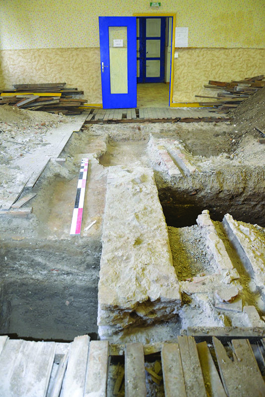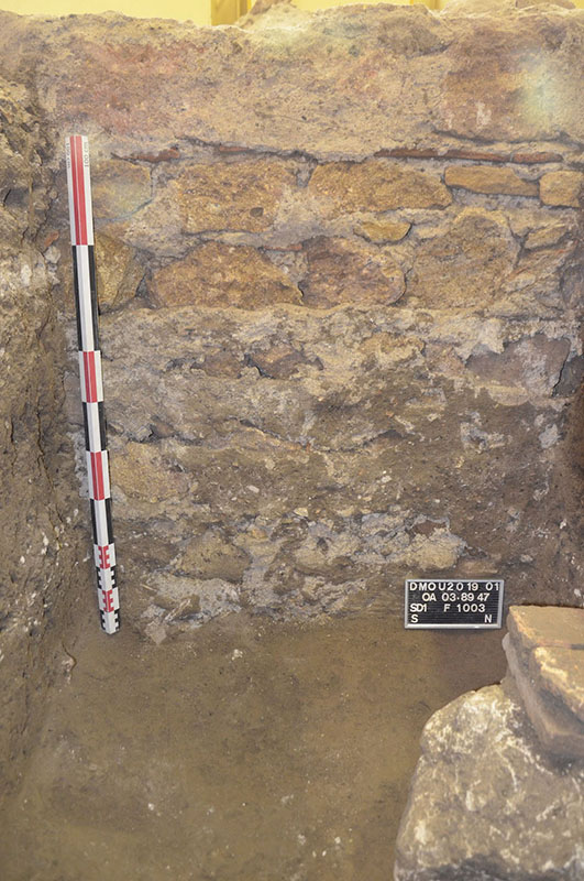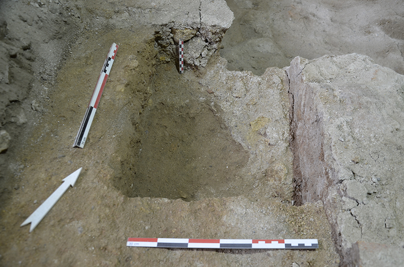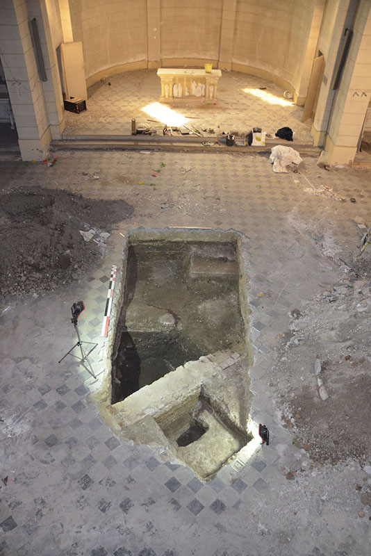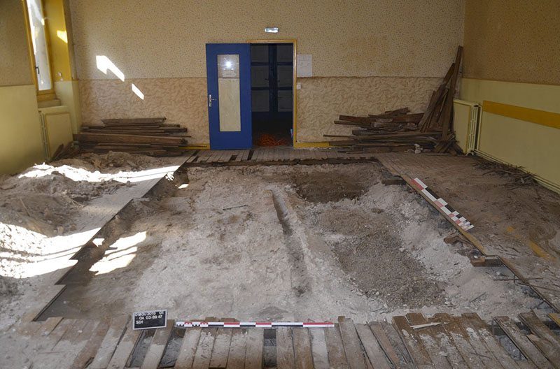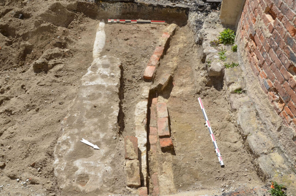 Dans l’ancienne chapelle, un sondage a révélé, au fond de la fouille, une bande de mortier rectiligne : il pourrait s’agir de la base d’un mur datant des 16e ou 17e siècles.