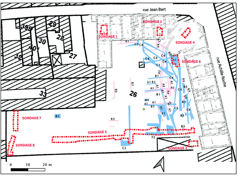 Dès cette période, les murs suivent déjà les orientations des rues actuelles (rue Jean Bart et rue Achille Roche), ce qui montre une certaine continuité dans l’organisation de l’espace urbain. Les sols associés à ces constructions présentent souvent au moins deux phases de réfection, ce qui prouve que les bâtiments ont été utilisés sur une longue durée.