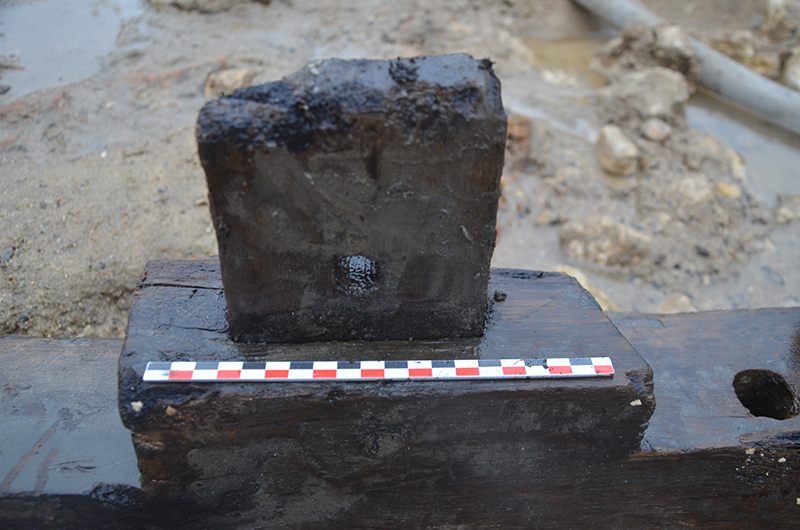 Le diagnostic s’est aussi intéressé au radier de fondation du pont Régemortes, construit entre 1753 et 1763. Cet ouvrage reposait sur un système de caissons de madriers, perpendiculaires au courant, assemblés à tenon et mortaise sur des pieux.