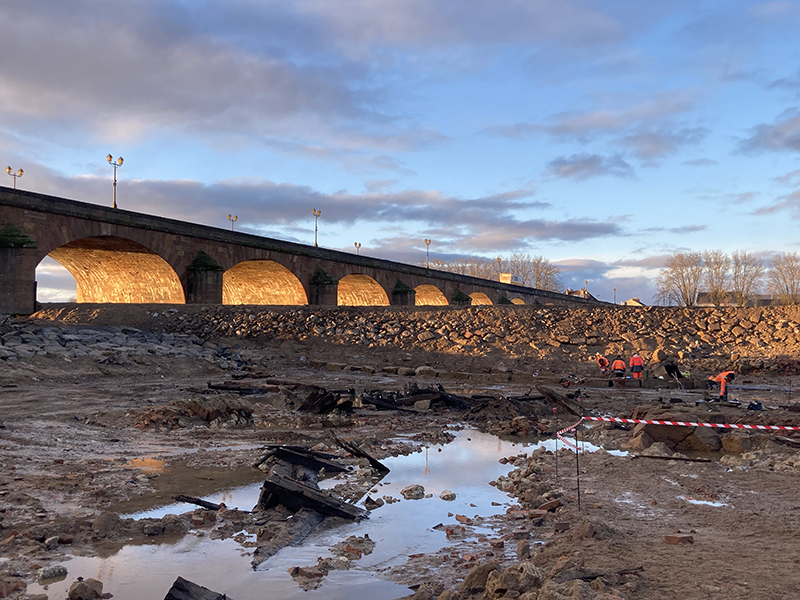 Cette fouille fait suite à un diagnostic archéologique réalisé par O. Troubat à l’automne 2021. Ce premier travail avait concerné la zone de la future passe à poissons, le radier du pont Régemortes et les fosses prévues pour l’extraction de sable. À cette occasion, les archéologues avaient découvert des alignements de pieux accompagnés d’enrochements, situés environ 235 mètres en aval du pont Régemortes. Ces structures pourraient correspondre à un ancien ouvrage destiné soit à canaliser la rivière, soit à faciliter la navigation, puisqu’elles suivent exactement la ligne de l’ancienne rive ouest de l’Allier. Les archives de Moulins mentionnent d’ailleurs à plusieurs reprises la construction de ce type d’ouvrages en bois pour ramener le cours de la rivière vers la ville. Des analyses au radiocarbone confirment cette information, en révélant des réparations effectuées depuis la première moitié du 15e siècle jusqu’à la construction du pont Régemortes en 1763.